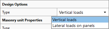 Two distinct design types are available: Vertical loads and Lateral loads on panels. Both are used to design load-bearing masonry, but the former is typically used for internal walls and the latter for external walls.